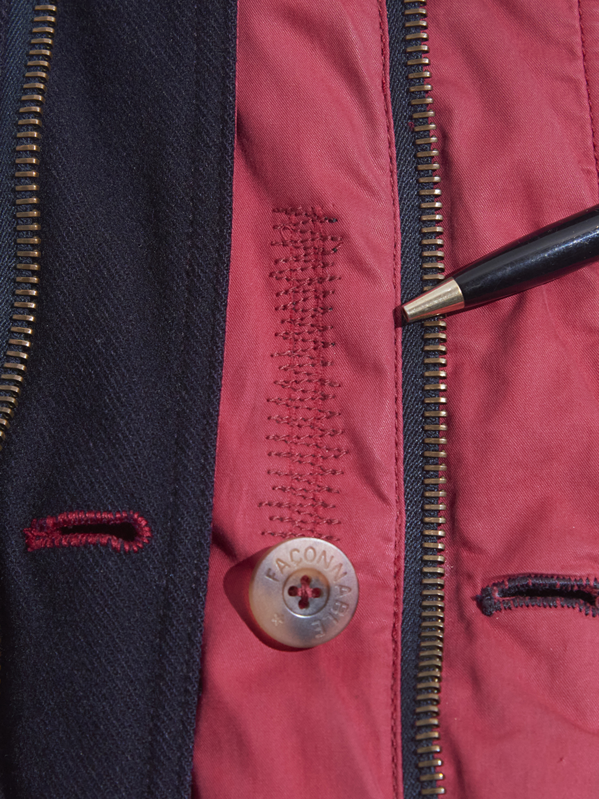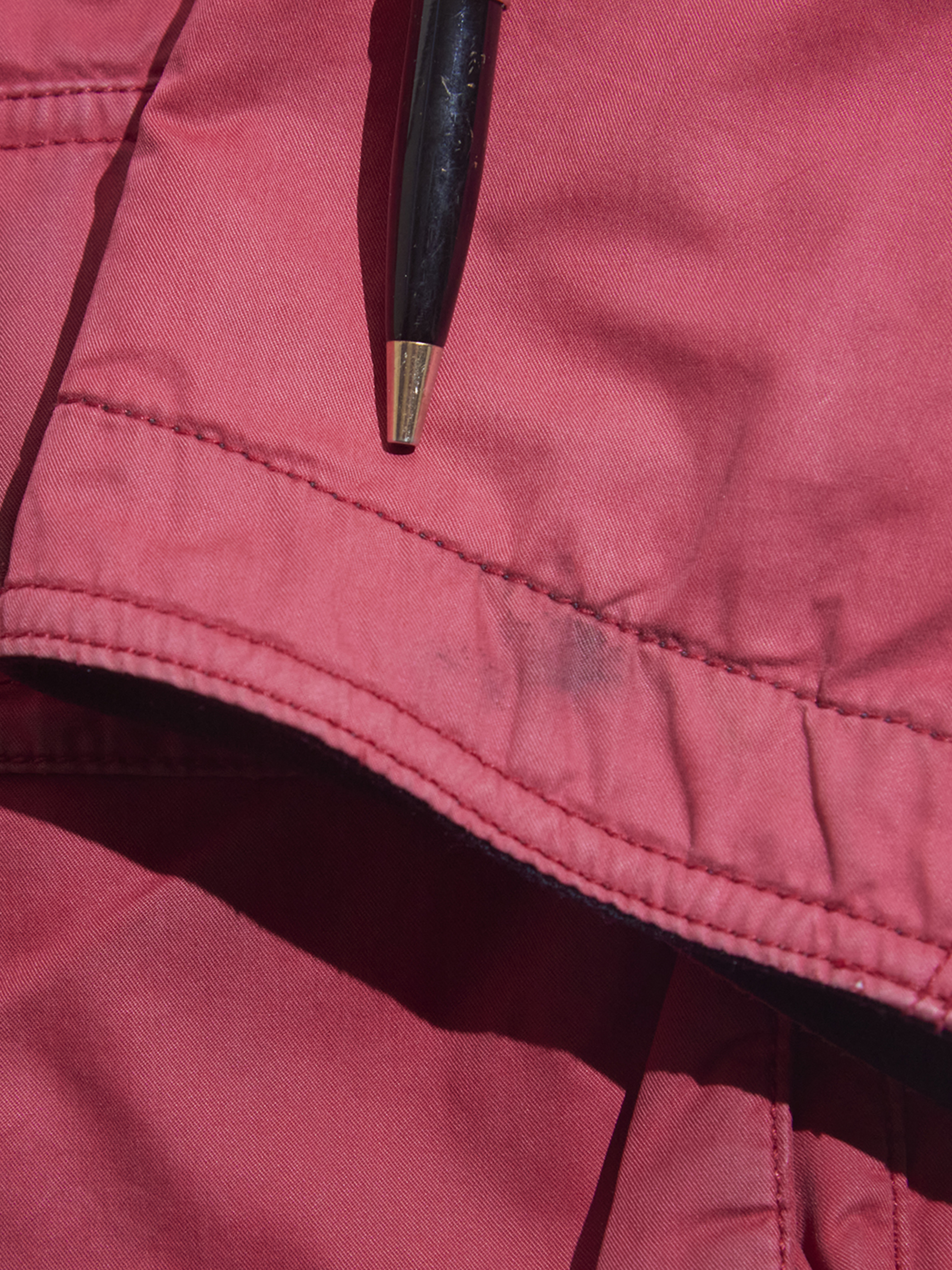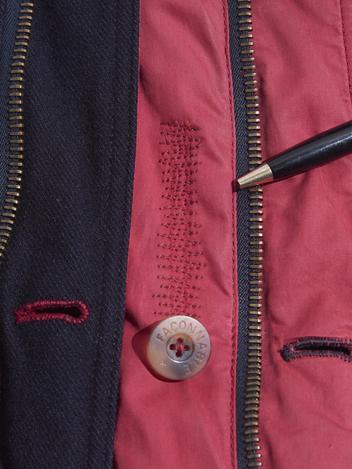 side B(RED)面の右下ポケットの左上&前立てにリペア箇所がございます。