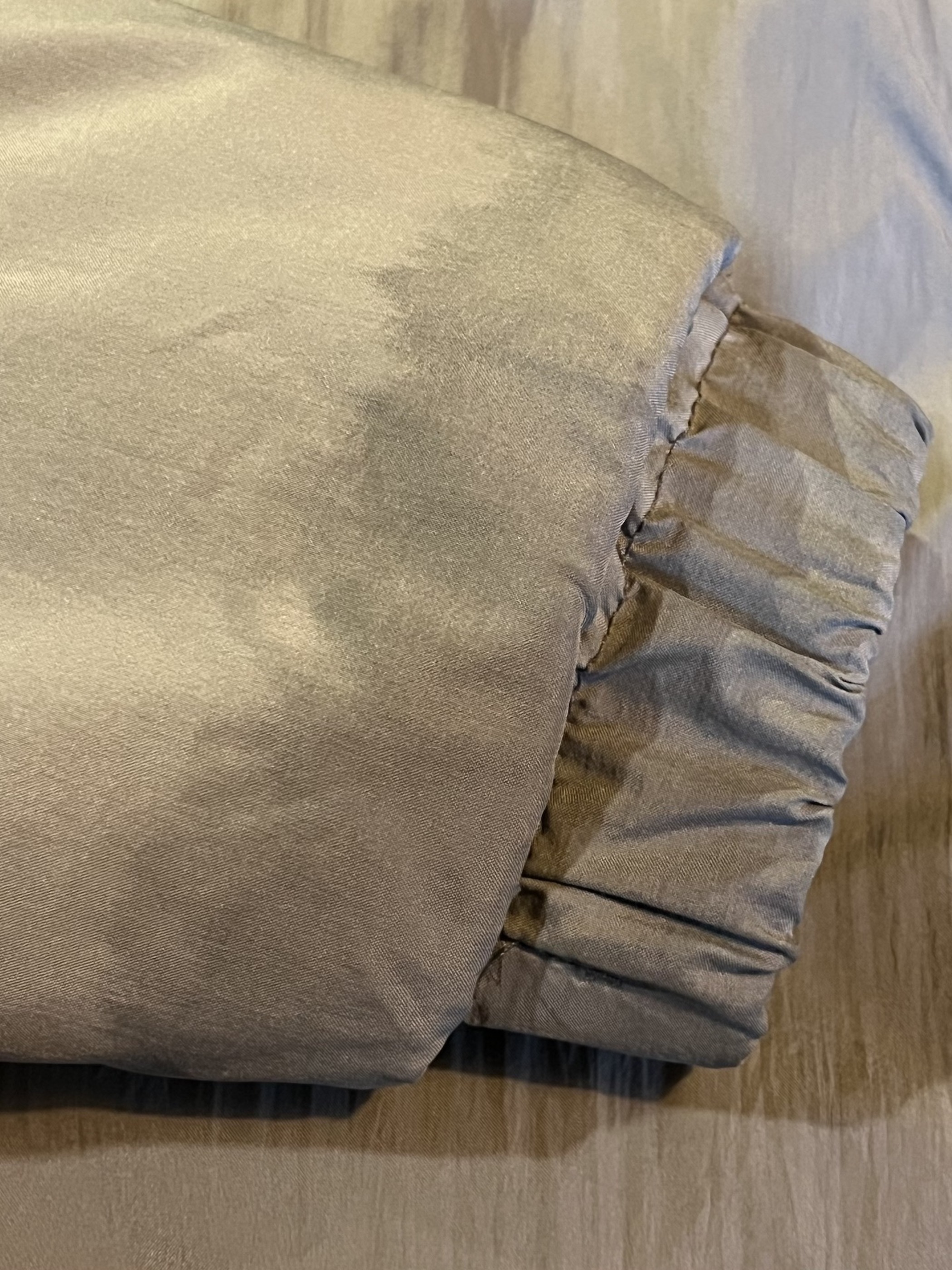 左右袖口付近や右袖方付近に広範囲の油シミ?のような変色箇所がございます。
